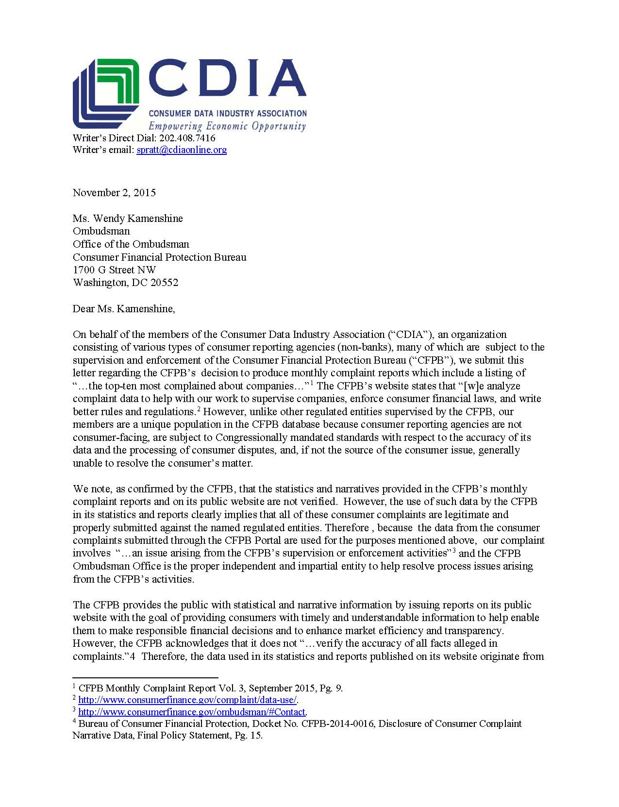 CDIA Complains to the CFPB Ombudsman About Complaints